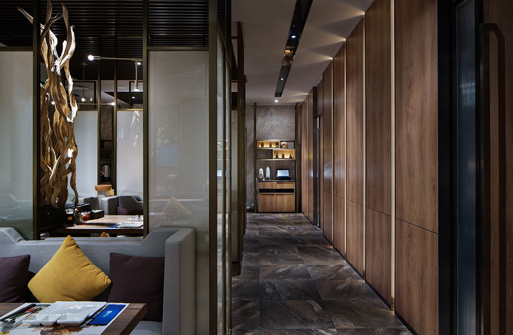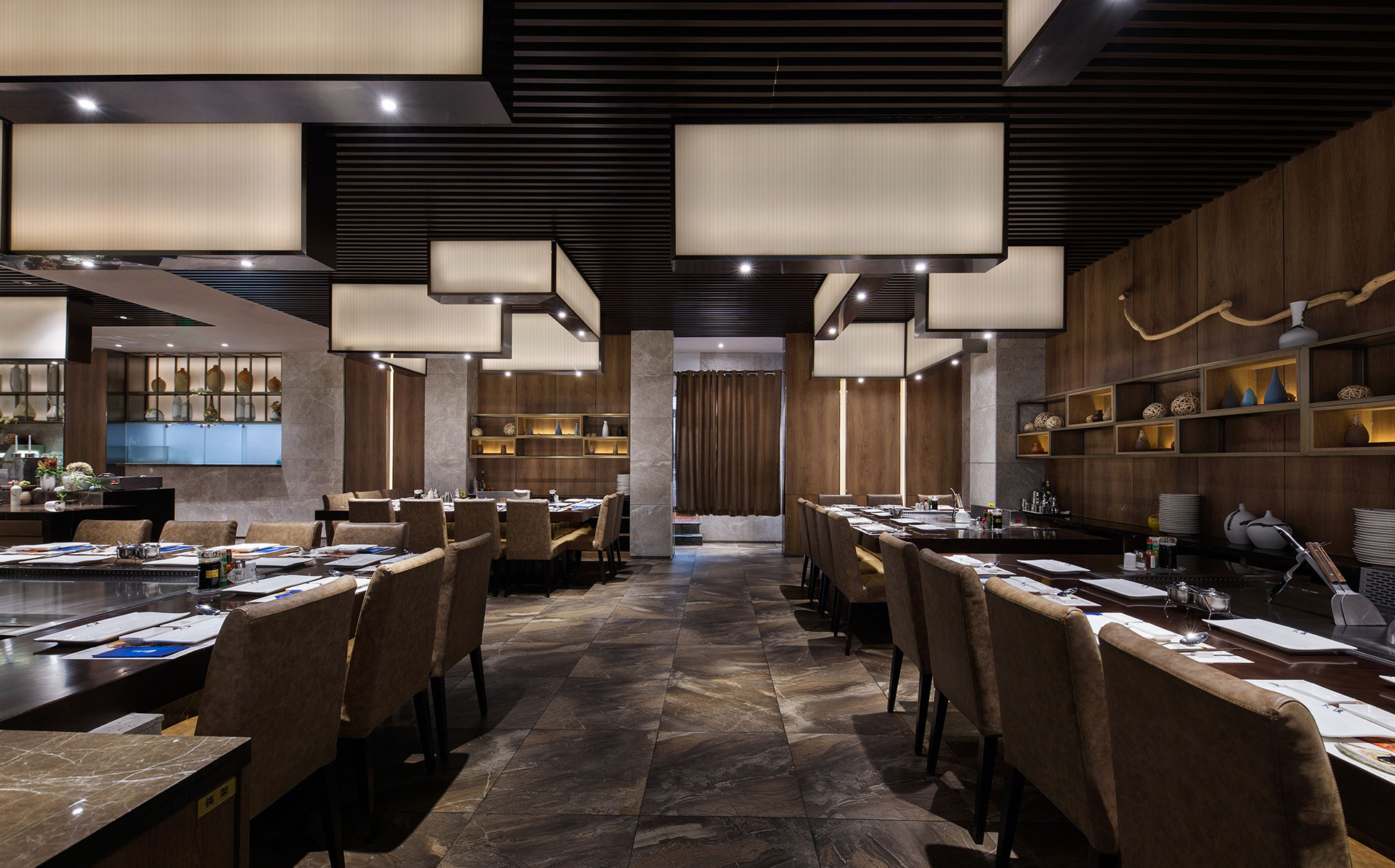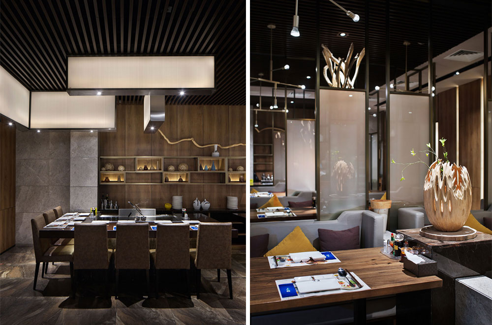 餐廳整體空間打造成暗色系氛圍來迎合室內(nèi)情境,用柔和的光感展現(xiàn)內(nèi)部的親密,略微幽暗的燈光透過玻璃與深木格柵,令人感覺靜謐而又溫馨,設(shè)計(jì)師將大面塊的大理石作為餐廳主要空間的貫穿和延伸,天然紋路的地磚鋪滿整個(gè)餐廳地面,與墻面木紋防火板相互映襯,恰好的燈光和閃爍的篝火烘托餐廳的整體氛圍,用材料的特性詮釋著低調(diào)奢華的空間內(nèi)涵。此外,餐廳的設(shè)計(jì)還引用鐵板燒的過程為概念:美味的海鮮在滾燙的金屬上被廚師燒制成舌尖上的美食,制作過程成為視覺一道亮麗的風(fēng)景線。