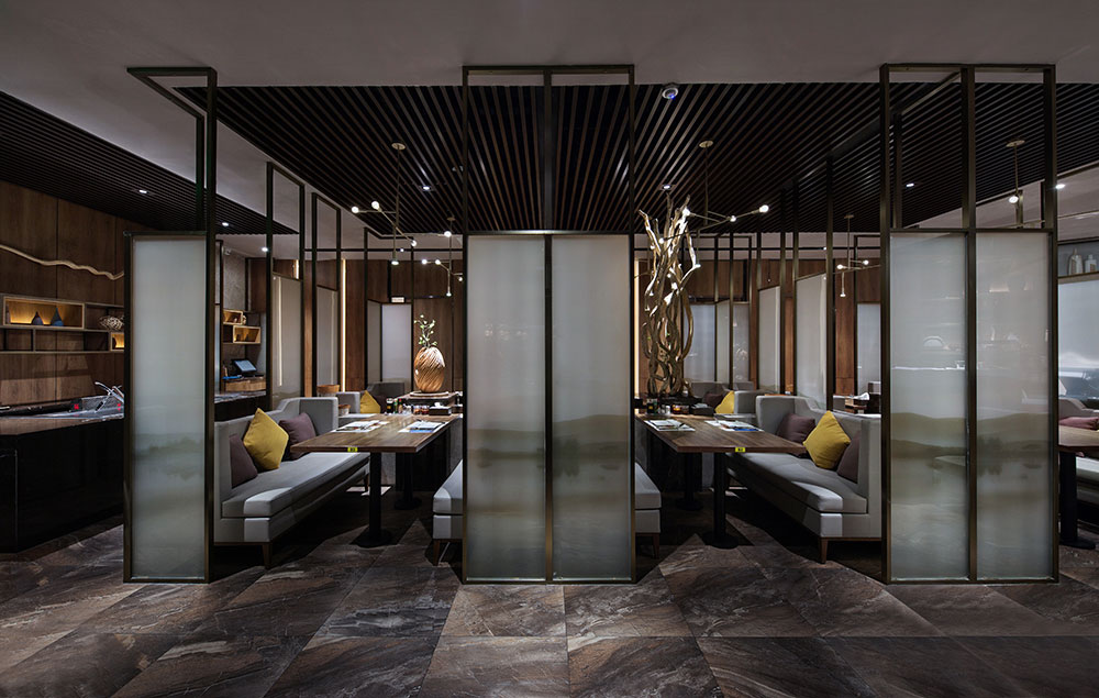 圍敞不再以嚴(yán)謹(jǐn)?shù)淖藨B(tài)存在:別具匠心地卡座區(qū)域以藝術(shù)隔斷形式劃分,用夾膠玻璃屏風(fēng)豎幅矗立高挑的空間,對(duì)夾膠玻璃屏風(fēng)以水墨為底,圖面為湖水景致。卡座風(fēng)格淡雅,素色沙發(fā)簡(jiǎn)練舒適,配有原始木頭工藝擺件裝點(diǎn),錯(cuò)落有致的吊燈凌駕于空中,營(yíng)造就餐區(qū)的靈動(dòng)格局,顯得精致愜意。有意留置這樣一處空間,此時(shí)此境,閑暇之余,忘卻城市喧囂煩憂,在內(nèi)用餐的客人仿佛浮生偷得一日閑,