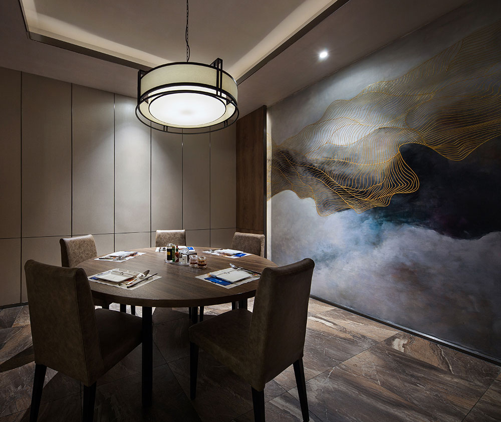 墻面肌理油畫尤為惹眼,其畫面蜿蜒綿,不僅增添了包間搖曳生姿的元素,也為顧客提供一個(gè)視覺高度融合的就餐環(huán)境。