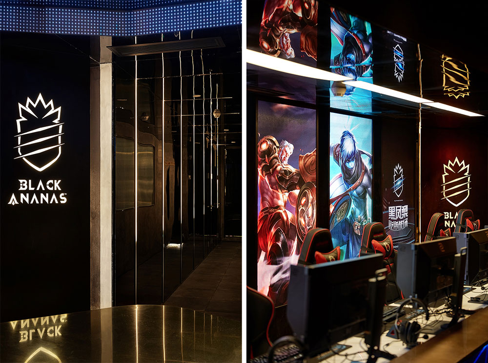 設計的最初起點來源于設計師幼年對游戲的記憶:城堡、峽谷、天使、翅膀、電光火石……無數的畫面在不同的空間環境中去改變,在自由的表達中重構,結合科技手游,構建了一個多樣的、有能量的、不可預測的全新世界,去承載每一個電競玩家的真實野心。在黑鳳梨玩游戲,仿佛置身游戲場景,玩家與游戲中的對應角色融為一體,與之情感呼應、與其心靈對話。