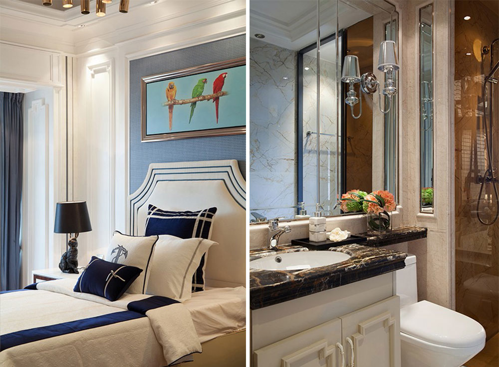 兒童房以簡單純粹的藍白色作為主色,象征孩子澄澈的世界。床背的邊角做了圓滑處理,床上用品皆采用絲緞般輕柔的面料,給孩子最貼心的呵護。孩子在夢里,是否會化身成小精靈,和墻上的鳥兒一起嬉戲呢?