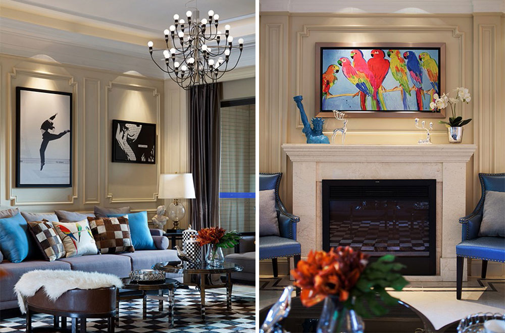 客廳設計以米白色為主色調,間以點綴些許清透的藍色,如白霧氤氳中隨風搖曳的楊柳,整體給人明凈清朗、如沐春風的感覺。墻面與天花上靈活多變的裝飾線條,讓空間充斥著浪漫優雅的歐式風格設計氣息。玲瓏精致的吊燈,高懸于天花中央,與下方的黑白格子地毯相得益彰。一組現代布藝沙發上擺放著多個具有藍天、飛鳥元素的抱枕,與電視背景墻上方一幅巨大的群鳥畫遙相呼應,五彩斑斕的顏色讓客廳變得更光彩明媚,仿佛鳥兒才是這空間的主人。黑白裝飾畫、大衛雕像、自由女神像、水晶鹿……這些裝飾品包含著濃濃的藝術氣息,讓客廳變得鮮活的同時,也彰顯了主人的高雅品位。