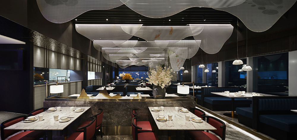 ? ? ? ??以食材為靈感的原鄉(xiāng),魚米意像看似不經(jīng)意地具化在空間里。門頭兩側(cè)有波紋造型隱藏其中,若隱若現(xiàn)卻又恰當(dāng)點(diǎn)題;前廳一對晶瑩靈動的游魚在進(jìn)門處自由奪目,迫不及待地將我們引入活色生鮮的味蕾之旅;湖色盡收眼底的大廳,頂部恣意垂下的金屬造型裝飾,仿若魚戲煙波,又如山水遠(yuǎn)闊。