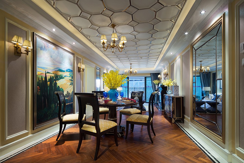 餐廳與客廳相連,一副巨大的田園風光油畫成為空間的焦點,山丘、綠樹、藍天、彩霞,人生一世,草木一秋,濃郁的鄉野氣息給空間增添了幾分純樸自然,給人一種回歸田園之感。餐桌上一束清新的檸檬黃,仿佛是從畫里走出來一樣,還裹挾著泥土的芬芳。木質墻上一面明凈的鏡子,則增強了空間的縱深感,讓餐廳更顯明亮開闊。