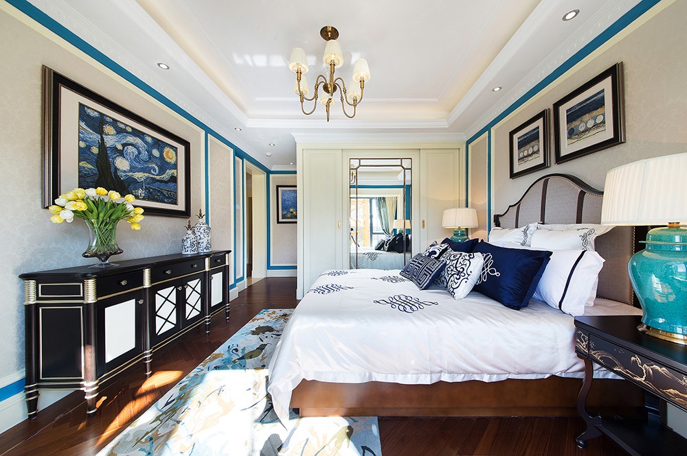 主臥將中式與西式、抽象與古典完美融合。起著框景作用的藍色線條是此間的一大特色,充滿強烈的動感效果。梵高的《星空》,神秘且遙遠;典雅的中國結和青花瓷元素,則傳遞出幾許悠悠古韻。抽象印花地毯,將客廳設計元素延伸到了臥室,整體統一協調。