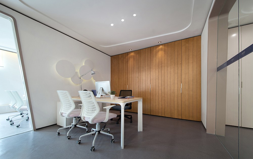 流線型的有機(jī)形態(tài)、簡(jiǎn)潔素雅的色調(diào)、造型獨(dú)特的桌椅,甫一開(kāi)始,前廳設(shè)計(jì)就奠定了整個(gè)辦公空間設(shè)計(jì)的基調(diào),給人簡(jiǎn)約靈動(dòng)、時(shí)尚大氣的整體感受。流體曲線結(jié)構(gòu)的接待臺(tái)以象牙白作為色調(diào),皎潔如玉,純凈雅致,配以前臺(tái)人員的笑容,使人如沐春風(fēng)。接待臺(tái)后側(cè)豎條狀的木質(zhì)裝飾墻,宛若一排整齊的琴鍵,彈奏著氣勢(shì)恢宏的交響曲,又似一卷綿長(zhǎng)的書(shū)卷,正展開(kāi)新的篇章。右側(cè)是訪客接待區(qū),一組特別配置的純色U形布藝沙發(fā),溫柔了每一縷風(fēng)塵,給人輕松愜意之感。