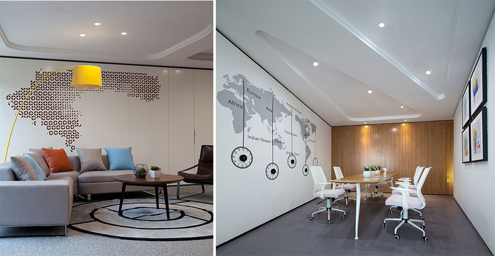 大會(huì)議室同樣以細(xì)膩的象牙白作為主調(diào),整體給人簡(jiǎn)約明凈的感覺(jué)。類橢圓形的天花吊頂設(shè)計(jì),既有凹面的視感,又有凸面的設(shè)計(jì)效果,十分巧妙。不規(guī)則的異形會(huì)議桌,與天花相映成趣。一組乳白的圓形狀壁燈造型,如一顆顆耀眼明珠,散發(fā)出明亮的光輝,又像一個(gè)個(gè)飽含思想的原子,在不斷交互碰撞,啟發(fā)創(chuàng)客們的創(chuàng)意與靈感。墻邊仿地臺(tái)設(shè)計(jì)的座椅,有效地?cái)U(kuò)充了會(huì)議室的容納空間,極富動(dòng)感的線條也讓空間更具韻律感。小會(huì)議室一面墻飾以世界地圖,另一面墻則以色彩豐富的掛畫(huà)作為裝飾,利于與會(huì)人員發(fā)散思維,提高創(chuàng)造力。現(xiàn)代風(fēng)格設(shè)計(jì)的三角形天花吊頂,是此間的一大特色,木質(zhì)方形會(huì)議桌,則極盡簡(jiǎn)約之美。