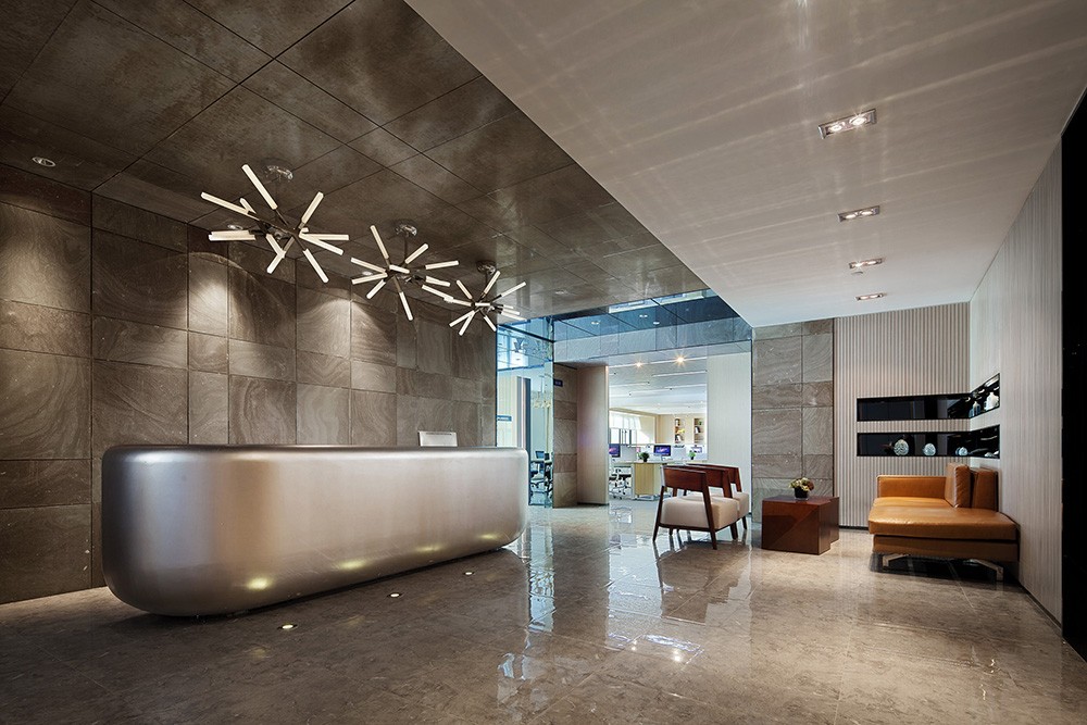 昆明海倫城市廣場(chǎng)寫(xiě)字樓樣板房設(shè)計(jì)的前廳設(shè)有前臺(tái)區(qū)及洽談區(qū)。整個(gè)空間呈現(xiàn)出一種前衛(wèi)的金屬質(zhì)感美,銀灰色前臺(tái)在不規(guī)則燈具的照射下閃耀著金屬光澤,金屬色墻磚在光影的作用下,顯現(xiàn)出獨(dú)特的紋理,順著背景墻一直延伸到天花,增強(qiáng)了空間的立體感,個(gè)性且神秘。白色從另一面墻延伸而上,與金屬灰“共享空間”,灰與白的對(duì)比,豐富了層次,使整個(gè)空間極具現(xiàn)代感與科技感。