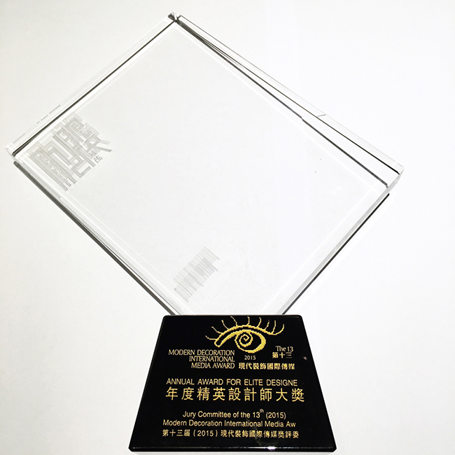 圖二: 第十三屆現代裝飾國際傳媒獎 ?朗昇國際商業設計師鐘建?!?015年度精英設計師大獎”獎牌