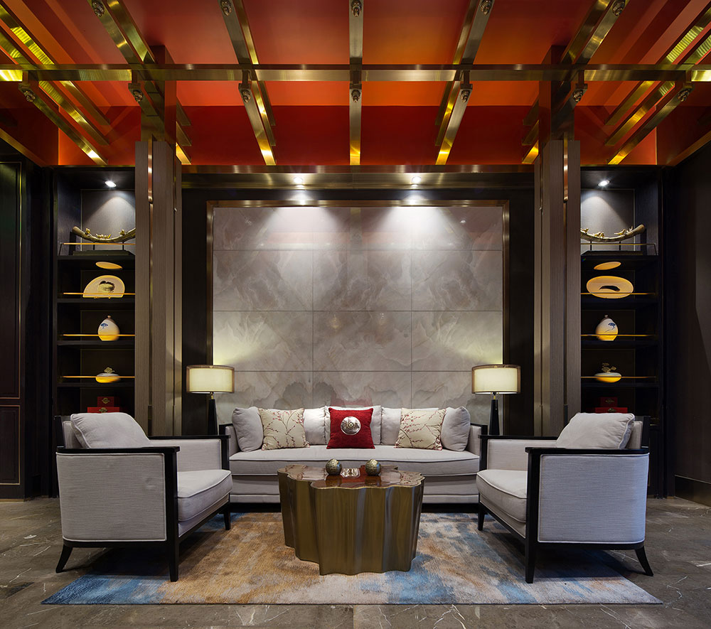 主要用材:石材、仿銅不銹鋼、木飾面、墻布等