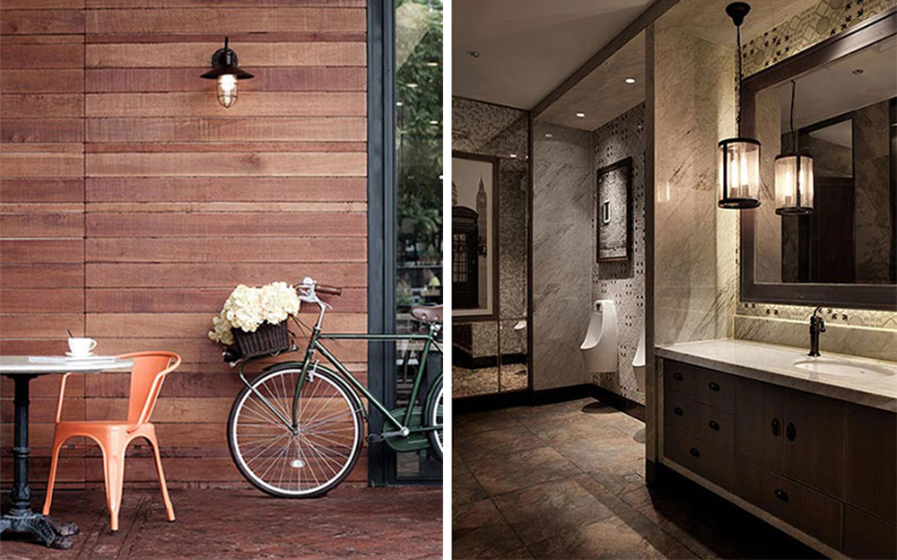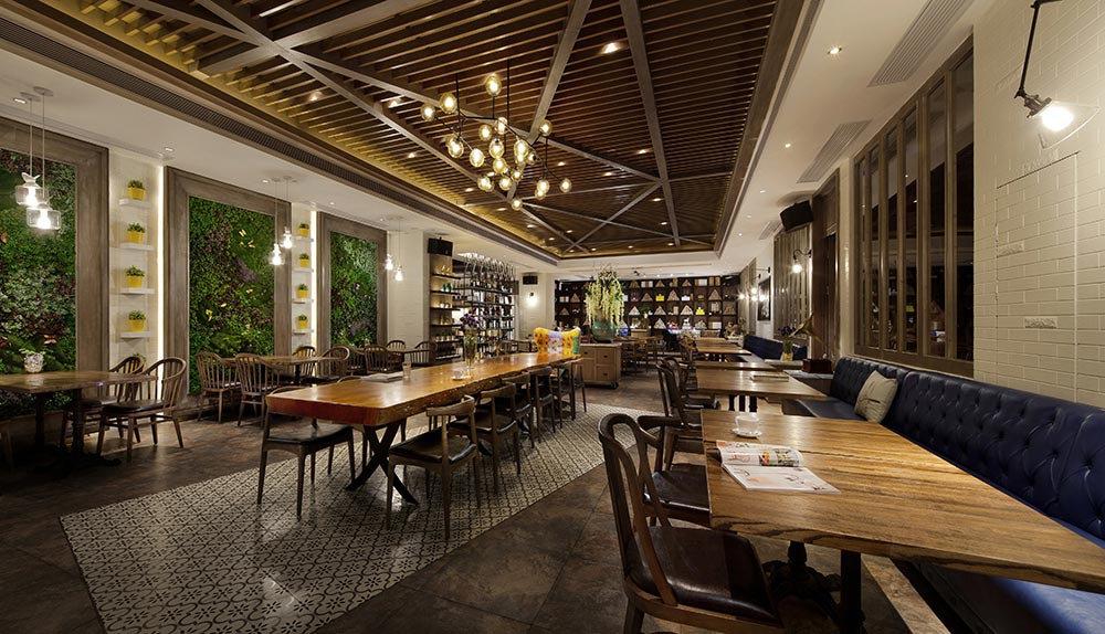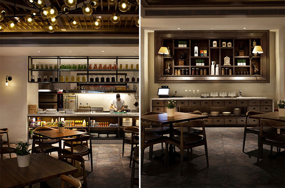 進入餐廳之前通過的花園餐廳,歐陸風情的藤藝桌椅,綠意盎然的木架藤蔓,以及隨意擺放的自行車、燈具等,讓人即刻享受到無限輕松自然的休閑感覺。點餐區(qū)簡潔明亮、現(xiàn)代大方,以體現(xiàn)輕食主義自然、健康的特點,但地面鋪貼的小花磚以及隨意擺放的椅柜及燈飾等,卻使現(xiàn)代風格中閃爍著絲絲復古氣息。