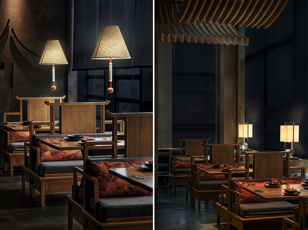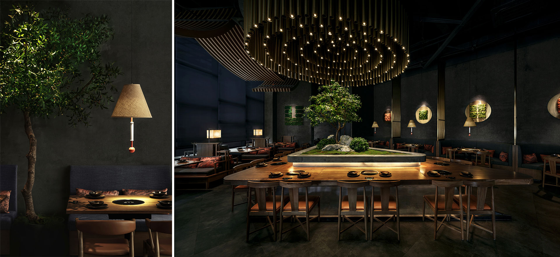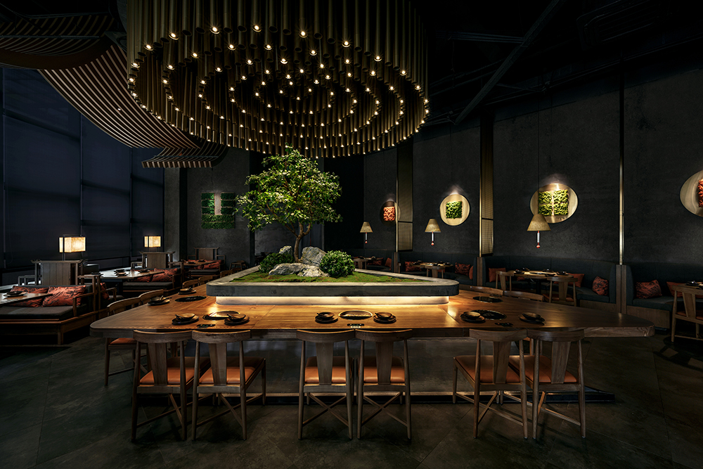 初始亦為回歸的禪意落筆在公共空間動線的終點,我們用完滿和圓融的形狀喻意生活的來時與歸處,場景上方宛若星系的圓形燈飾,是大自然“天時、地氣、順風”之意所向,美食與設(shè)計都是生活的藝術(shù),來源于生活的點滴升華為精神世界的向往,以此為感悟,在空間中傳遞寧靜致遠的心靈意境。