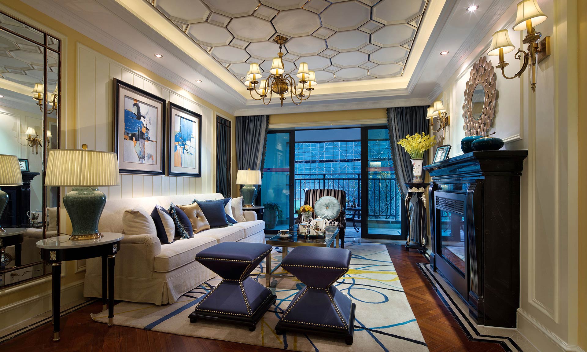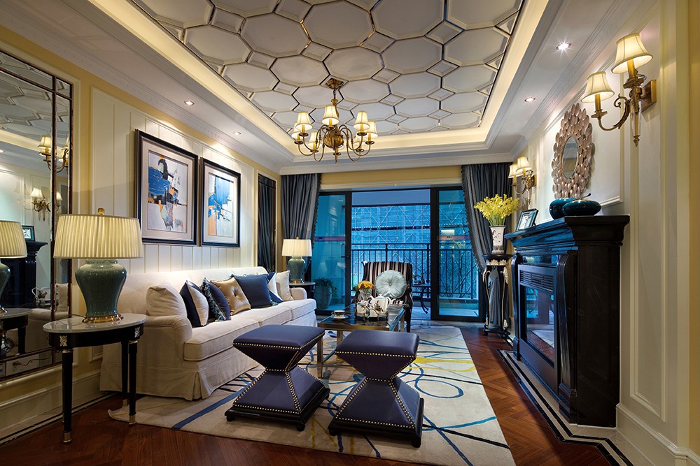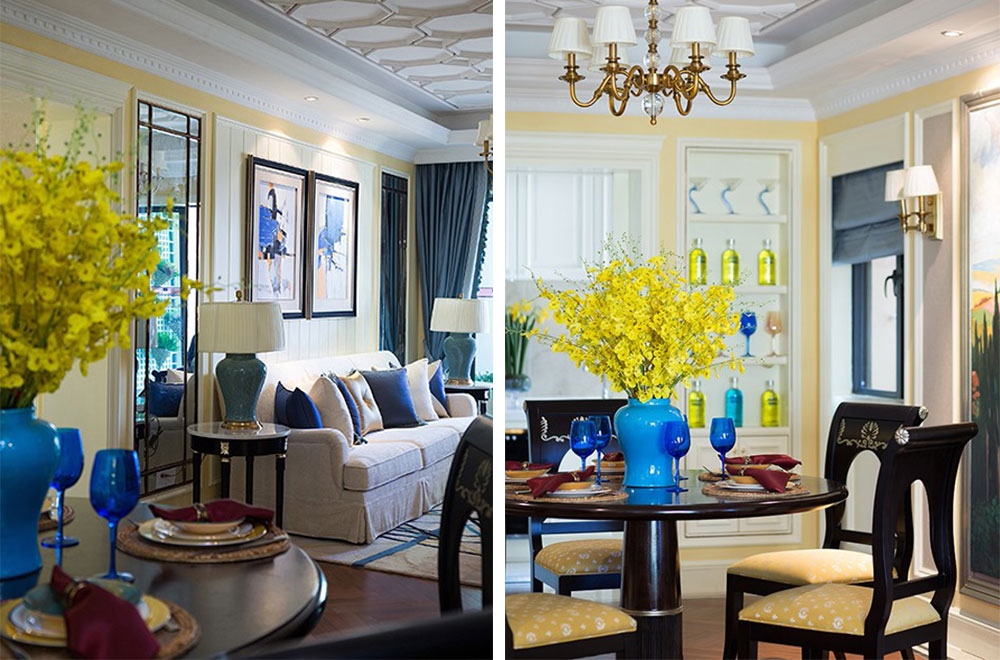 本套樣板房設計以歐式田園風格設計為主,與現代元素相結合,并輔以少量東方元素作為點綴,整體空間以藍、黃色作為色彩基調,使用優雅的黑、白色中和,浪漫的歐式經典藍、黃色絲質布藝與抽象紋樣地毯、掛畫、燈具相搭配,營造了精致細膩而又自由浪漫的空間格調,呈現出充滿自然氣息的田園風情。