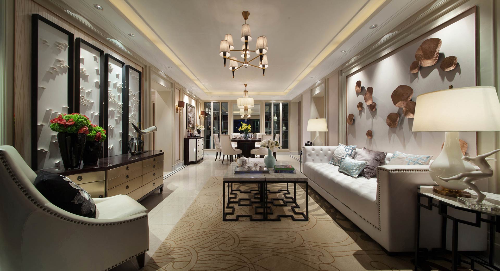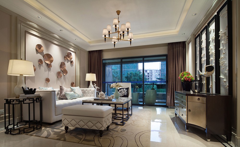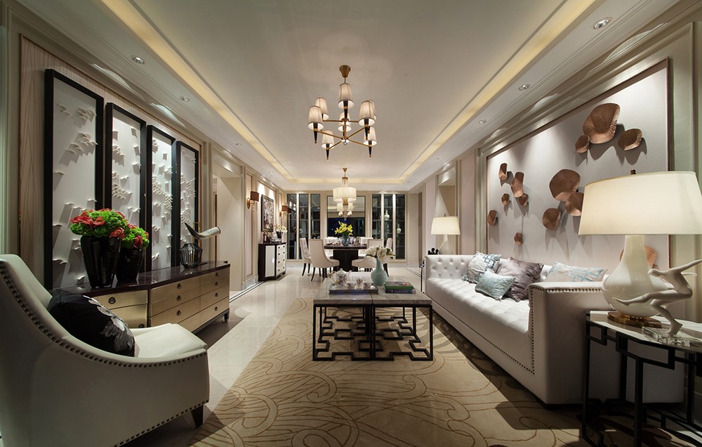 昆明海倫國際米蘭區的樣板房設計面積為120平方米,以時尚歐式風格設計為主,輔之以少量的東方古典元素進行點綴,以米黃色和金色為主的暖色系使得空間一如春日的暖陽灑進室內,令人重溫一段歐式溫情。
