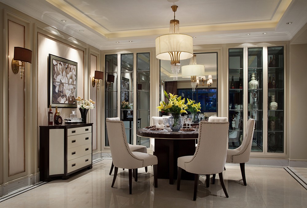 步入餐廳,地磚、皮質座椅和時尚的酒柜的完美搭配,營造出典雅的歐式風范,使人不禁想聽一段薩克斯曲,品一口醇香紅酒,身臨其境感受優雅生活。朦朧的燈光使整個餐廳顯得高雅而靜謐,鏡子在視覺上加深了空間的縱深感,顯得恢弘大氣。而餐桌上清新的花束,為整個空間增添了一抹暖黃。