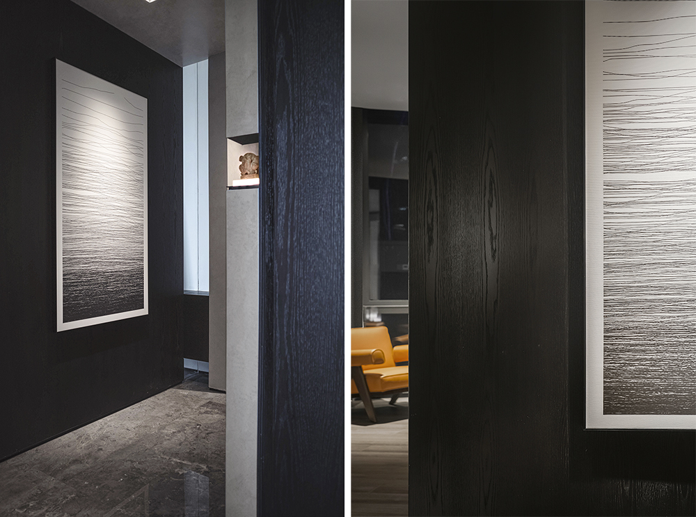 黑白灰,是在腦海里最先閃出的空間構(gòu)圖,以此為水墨慢慢展開心中的畫卷。時間攝影師杉本博司的作品、黑白畫面里的電影江湖徐徐落筆。每當夜晚來臨,坐在辦公室或者公共區(qū)域的某個角落,外面的喧囂仿佛與自己無關(guān),心中的世界波瀾暗涌,一種置身江湖而又冷靜旁觀的奇妙感覺總能為設(shè)計師帶來創(chuàng)作的靈感。